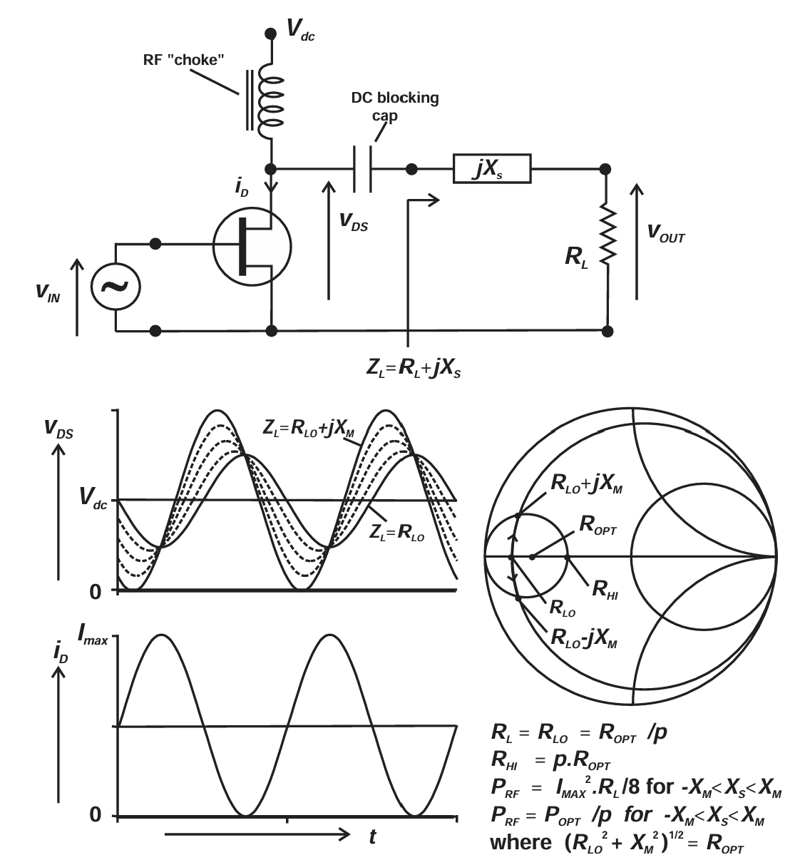 图2.8 Class A linear power amplifier case 2: output load resistive component lower than ROPT. For RL=ROPT/p, RF power output is POPT/p, over a range of series reactance---XM<0<XM.