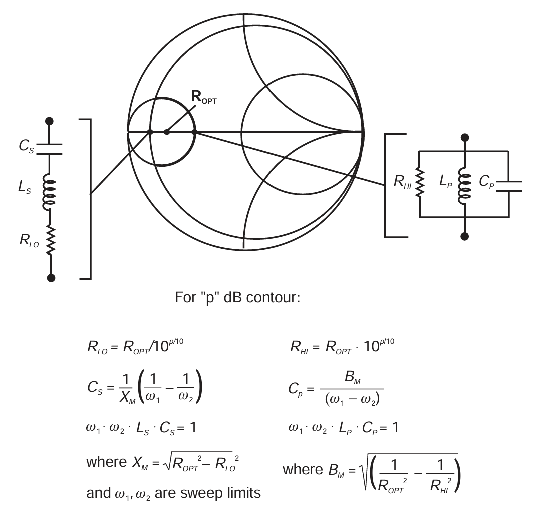在图 2.10 中,很明显负载牵引等高线的两个弧段可以用串联和并联 LCR 电路来建模 。可以选择这些组件的取值,使得在针对特定设计所使用的频率扫描范围内,这些"虚拟"电路的阻抗正好覆盖目标区域,从而定义每个等高线的实际边界。图 2.14 显示了构建这些电路的方法,并给出了元件值与所需等高线(以 dB 表示)以及频率扫描范围之间关系的公式。显然,当扫描范围改变时,这些元件的取值也必须随之改变,但大多数 CAD 软件都允许将元件的值定义为依赖于频率范围或电路内其他元件值的表达式,因此这使得绘制等高线基本上可以独立于频率扫描设置。