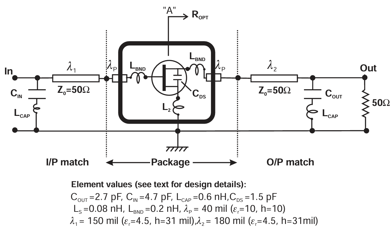 该设计基于一个典型的 1 瓦 GaAs MESFET,工作频率为 1.9 GHz。这是一个 A 类设计;因此最终设计无法满足蜂窝手机功放的效率要求,但用于说明目前已讨论的设计原理非常合适。