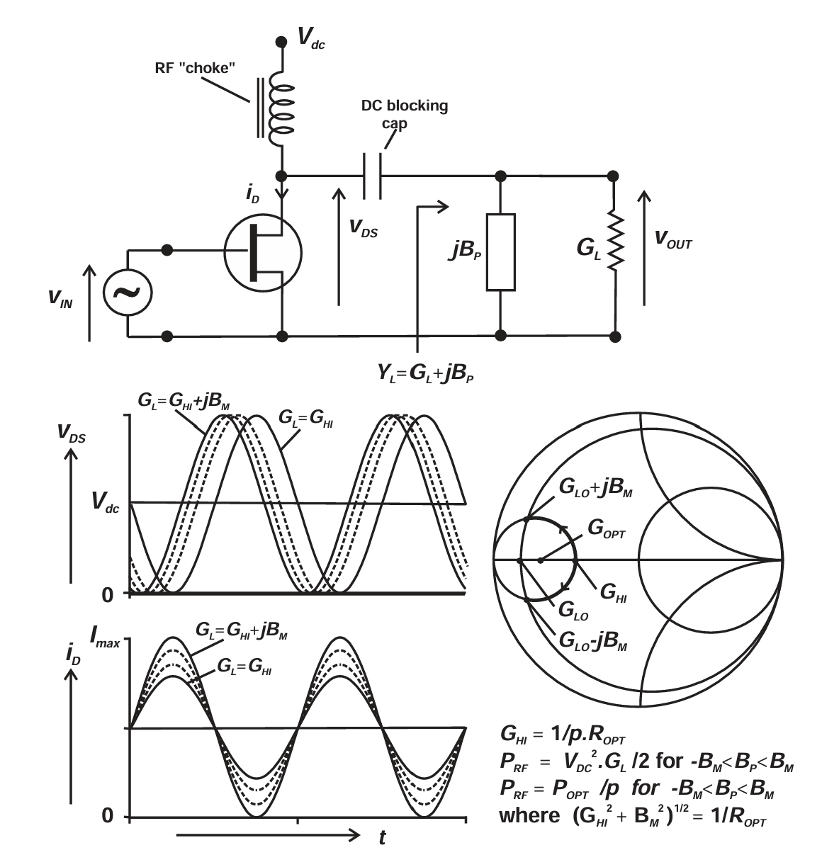 图 2.6 进一步展示了用于分析该理想器件的 RF 电路。输出(漏极)通过 交流耦合连接至 RF 负载。直流偏置通过一个 RFC(射频扼流圈) 提供,且 RFC 在工作频率处的阻抗非常高。一个重要的细节是尽管晶体管被视为一个理想的压控电流源,射频负载会含有一定的无功分量,而晶体管的输出寄生参数被视为负载的一部分。