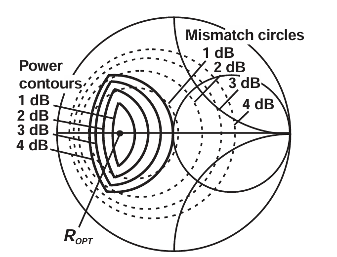图2.11 Power-match contours (solid, 1 dB to 4 dB contours shown), compared with gain mismatch circles (dotted) based on a source impedance equal to the optimum power match (ROPT = 20Ω).