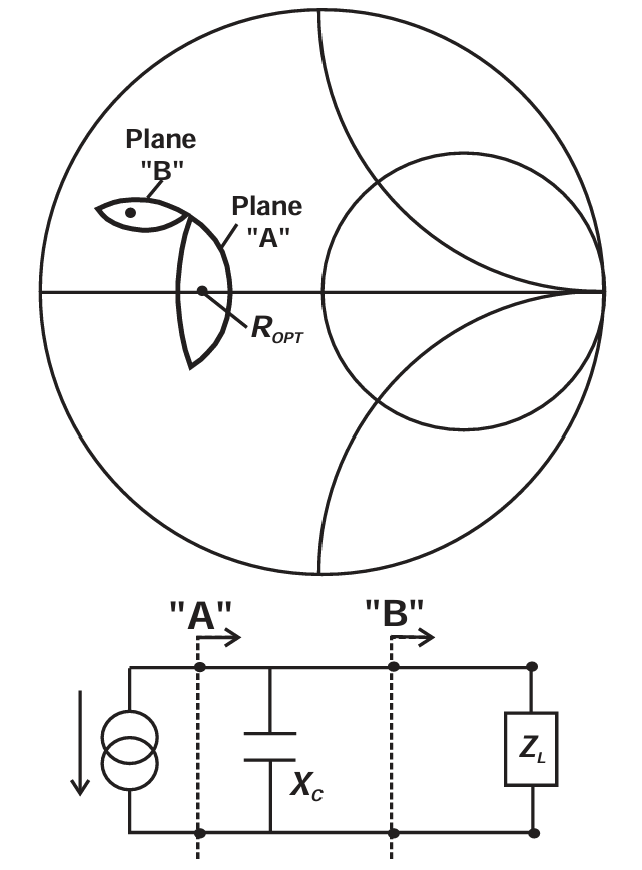 这两段等功率弧线恰好分别沿着印刷式 Smith 圆图上的等电阻圆(R = Ropt / p)和等电导圆(G = 1/(pRopt))继续前进。剩下要证明的是,整个轮廓确实是封闭的,并且这两条弧线的终点在其交汇处重合。所需做的仅是证明 阻抗Ropt/p + jXm 与导纳 1/(pRopt) + jBm 表示的是同一个阻抗,其中