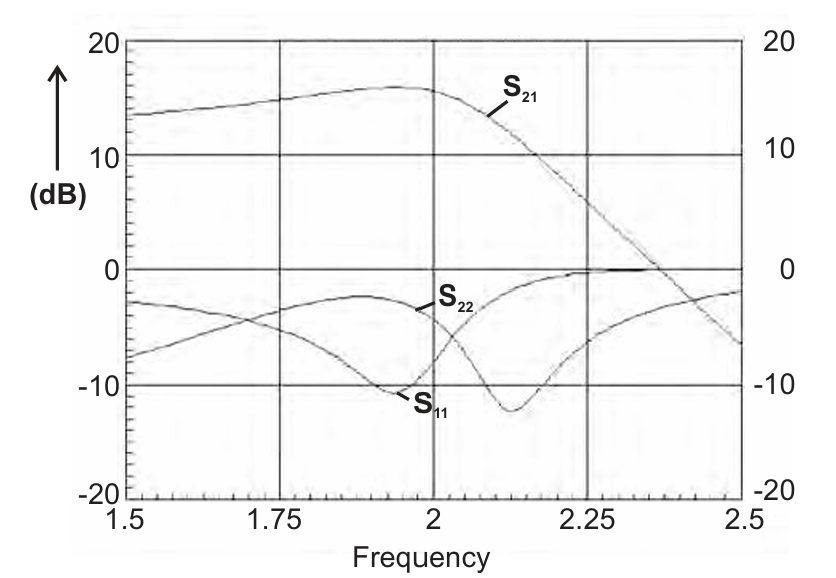 在已经完成输出侧的最佳功率匹配设计后,现在可以使用标准的线性技术完成输入匹配的设计 。由此得到一个类似的单节低通输入匹配网络,如图 2.15 所示。整个放大器的线性响应可以绘制出来,包括输入和输出 VSWR,如图 2.19 所示。注意,用整体的 s22 来测量的输出 VSWR 较差,回波损耗约为 3 dB。部分原因是输入匹配中存在电抗成分(k 接近 1),但主要原因是输出侧的功率匹配。即使使用有损元件降低输入网络的 Q 值,输出端仍然无法与 50 欧匹配。这实际上就是当前设计与简单线性共轭匹配设计之间的主要区别:后者能提供良好的输出 VSWR,但其最大输出功率可能会低 2--3 dB。
