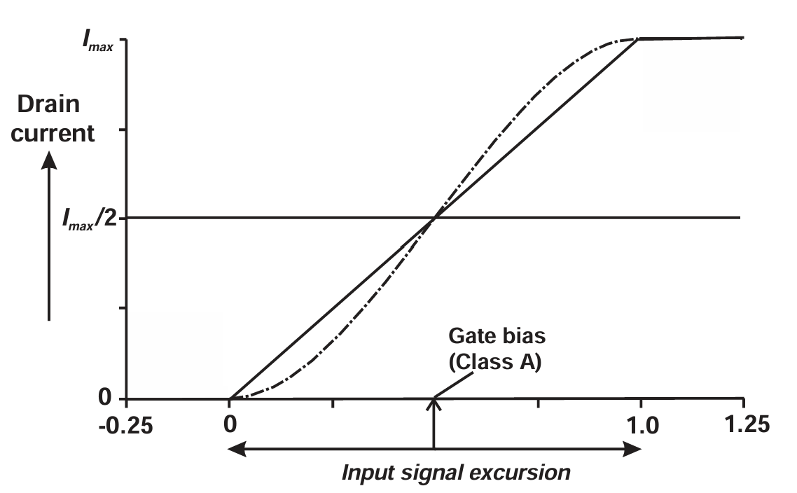 图2.1 FET Class A bias point (see also Figure 1.3). The solid line represents an ideal strongly nonlinear response, used for simplified analysis; the dotted line shows the more realistic weakly nonlinear response, with low-level harmonic generation even at low signal levels.