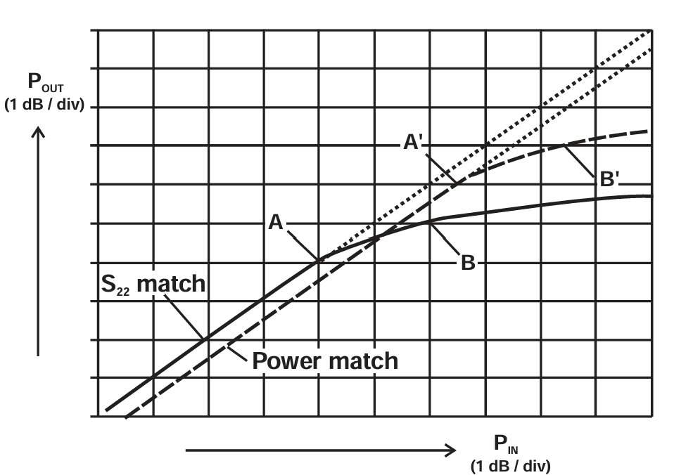 图2.2 Compression characteristics for conjugate (S22) match (solid curve) and power match (dashed curve). The 1 dB compression points (B, B') and maximum linear power points (A, A') show improvements under power-matched conditions.