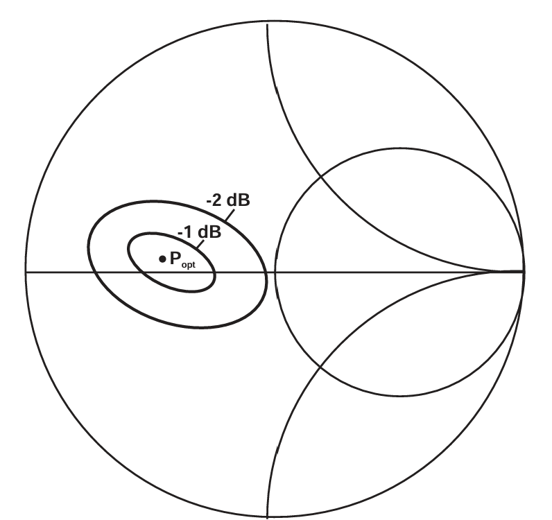 图 2.2 中的两条功率扫描曲线表明,输出功率与输出匹配之间存在某种函数关系。逻辑上的下一步,就是测量两个以上的数据点。这种测量被称为 负载牵引测量,这个名称可能源于对 RF 振荡器进行的类似测量。在最简单的形式中,负载牵引测试系统由被测器件和其输出端的一种带校准的可调谐网络构成。输入端通常也会是可调谐的,但主要目的是为了提高器件的功率增益,因此输入匹配一般会在每个频率点都被固定为接近良好匹配的状态。某些类型的 RF 晶体管(尤其是双极型晶体管)会表现出输出功率对输入负载的显著依赖性。在实际测试中,要区分真正的 "源牵引" 效应与输入匹配变化导致的增益变化,并不容易。那些表现出最显著源牵引效应的器件,通常工作在接近其最大可用频率的状态下,而这种情况最好通过采用更高频率的工艺技术来避免。