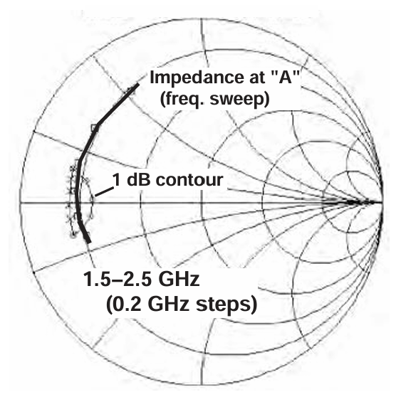 图2.16 Plane A impedance sweep, with 1 dB power contour (single-section matching network).