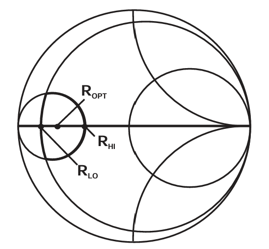 图2.10 Constant power contour for p = 2 (--3 dB). Closed contour is formed by intersecting circles of constant resistance (R = RLO = ROPT/p) and constant conductance (G = 1/RHI = 1/pROPT).