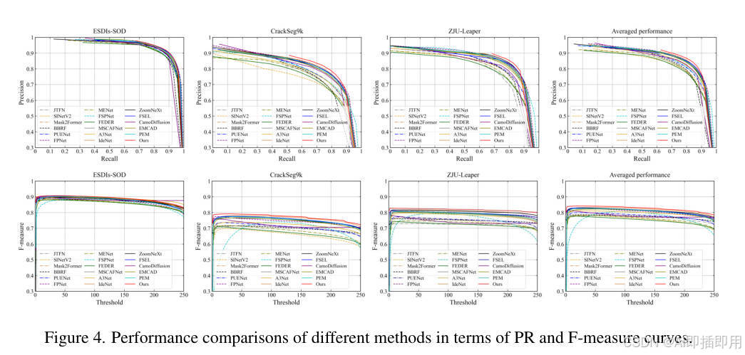 - PR 与 F-measure 曲线: 如图 4 所示,WPFormer 的曲线在大多数阈值下都包络了其他方法的曲线,进一步证明了其性能的优越性 。