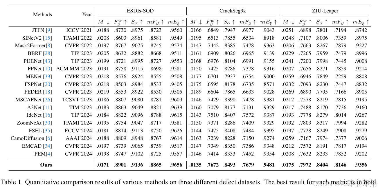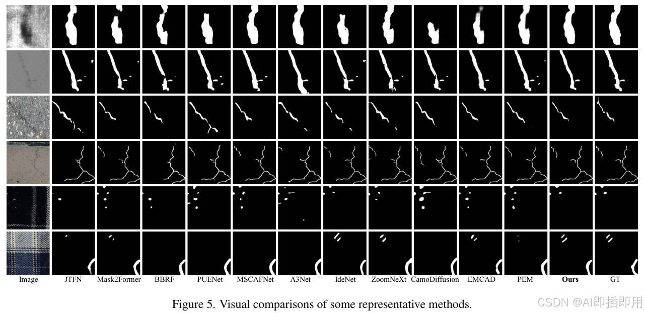 - 定性对比: 可视化结果(图 5)显示,WPFormer 能更完整地检测出与背景相似度极高的微弱缺陷,并且不仅有效抑制了背景噪声的误检(如第 2、3 行),还能精准分割出细小的裂缝(如第 3、6 行)。