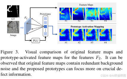 FeatureMaps(原始特征): 上排的原始特征图(#1 到 #4)显示,特征响应非常杂乱 。虽然缺陷区域(中间的白色裂纹)有激活,但大量的背景区域 (如纹理)也被高度激活。Prototype Activation Mapping(PCA 特征): 下排是经过PLU(原型学习单元)处理后的特征图。效果立竿见影:背景噪声几乎被完全抑制 (变为深蓝色),而缺陷区域的激活变得极其干净、锐利和聚焦。
