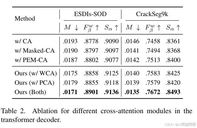 PCA 模块: 结合全局和局部的 query-prototype 交互方式比单一尺度更有效,证明了多尺度关系在 query 更新中的重要性 。 - Cross-Attention 机制: 相比于标准 CA、Masked CA 和 PEM-CA,WPFormer 的双域交叉注意力机制能自适应选择有意义的特征,减少细节丢失,平均 F β w F_{\beta}^{w} Fβw 提升超过 1.6%。
