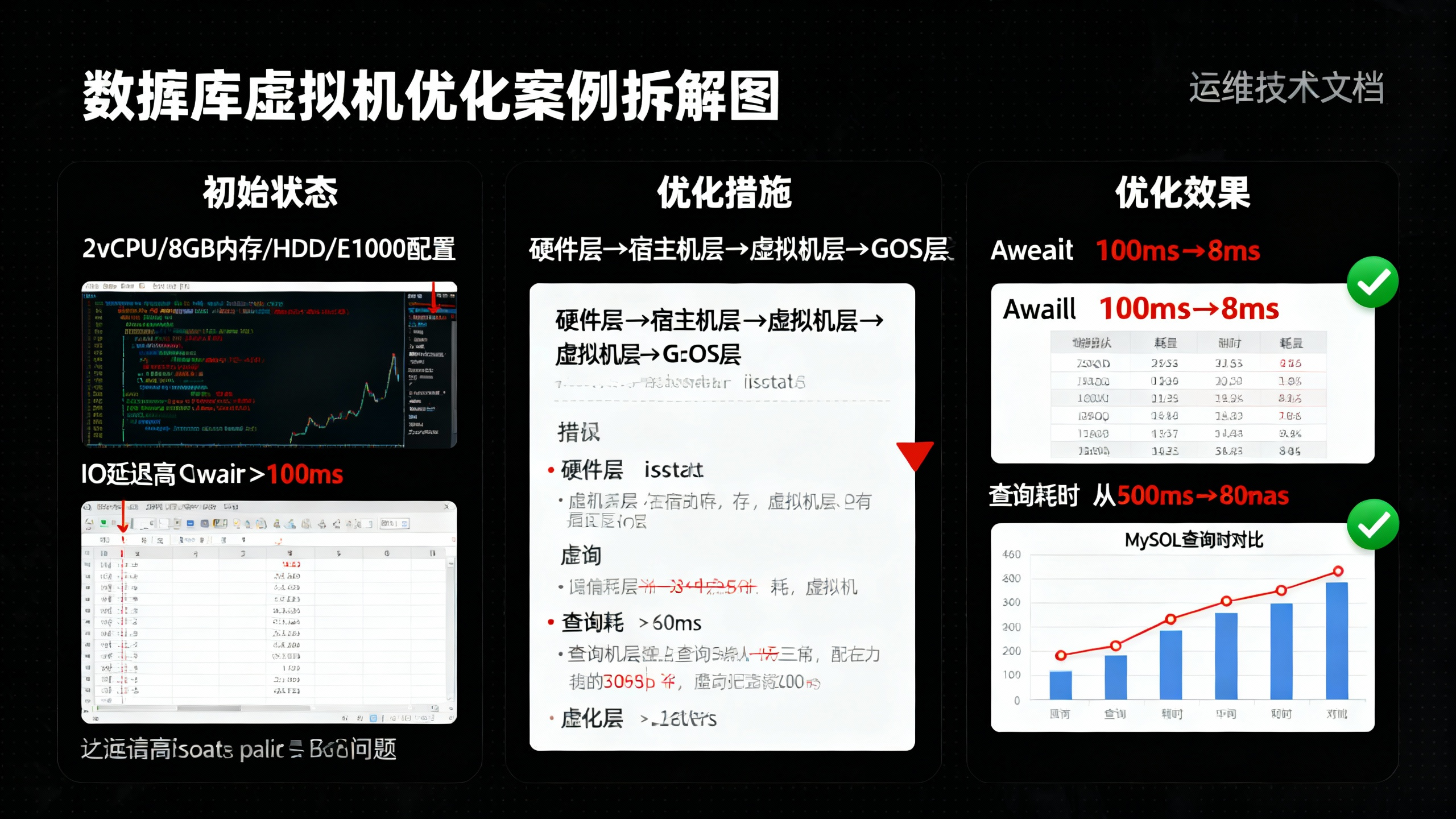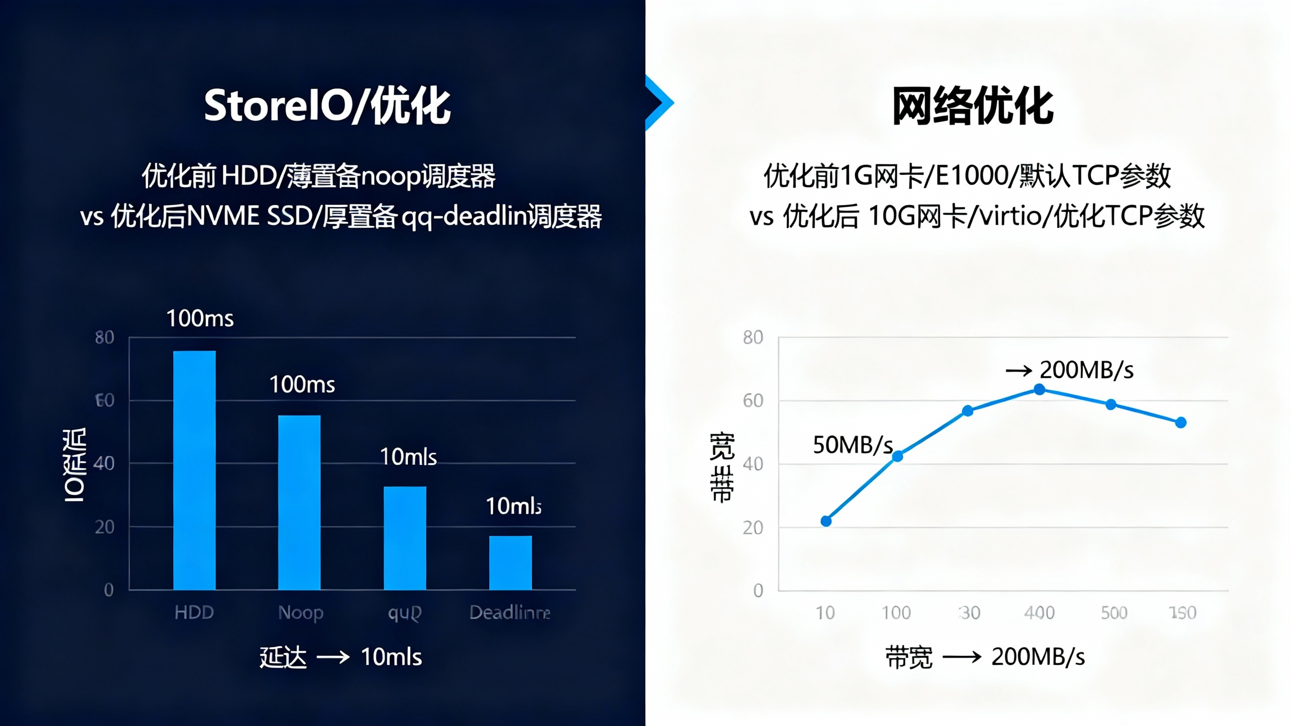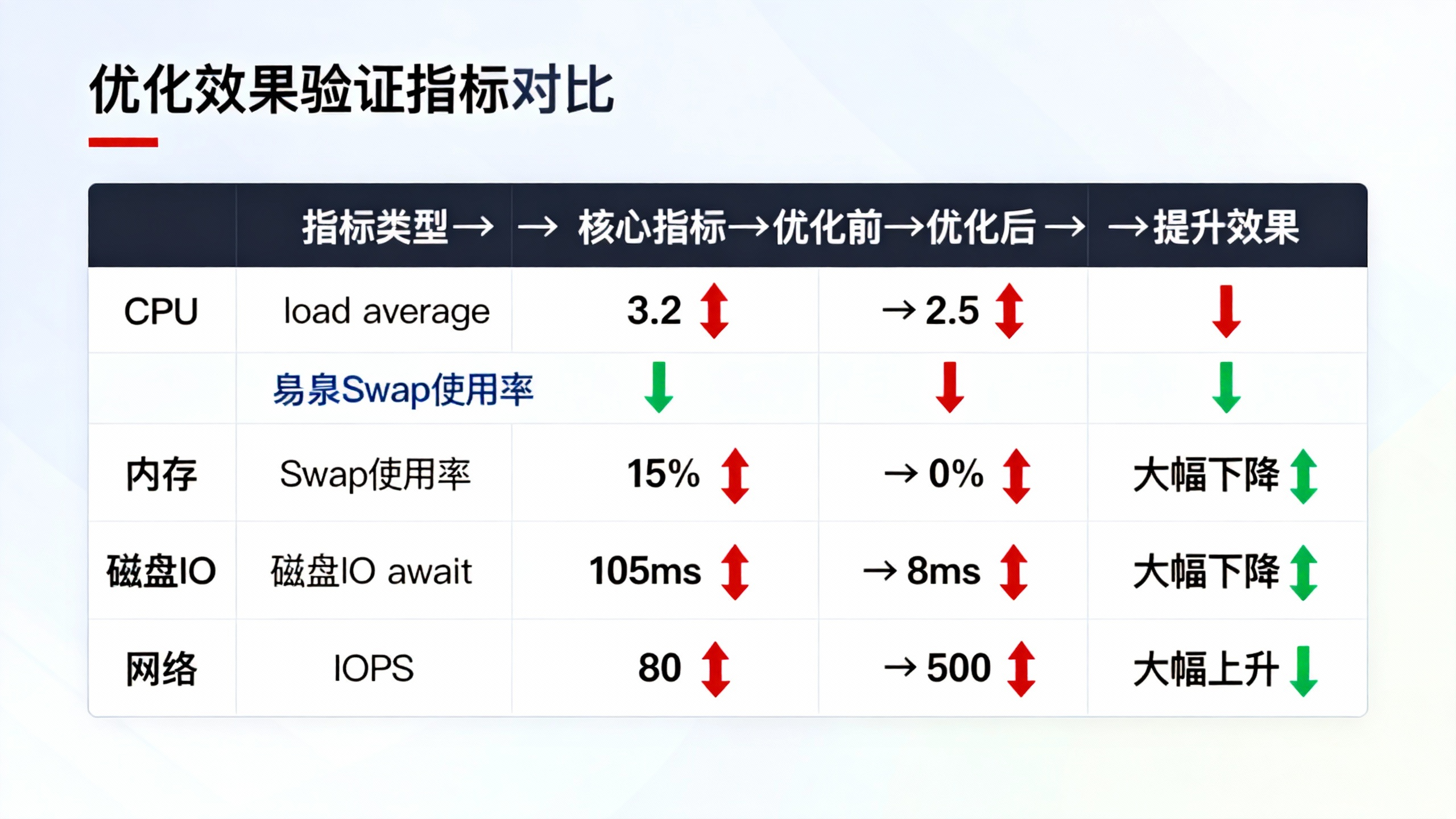 | 磁盘IO | await、IOPS、吞吐量 | await=105ms,IOPS=80,吞吐量=50MB/s | await=8ms,IOPS=500,吞吐量=200MB/s | IO延迟降低92%,吞吐量提升300% |