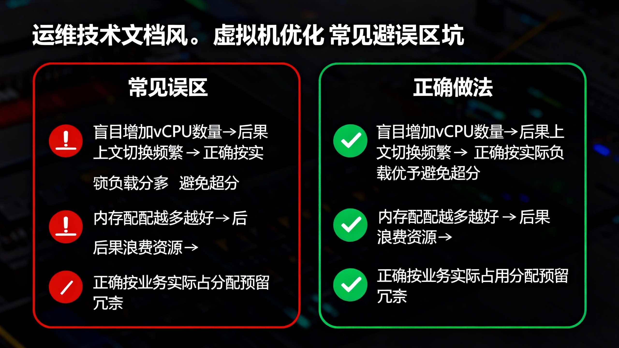 误区1:盲目增加vCPU数量 → 后果:vCPU过多导致上下文切换频繁,CPU利用率反而下降;正确做法:根据实际CPU负载分配,避免超分过度。