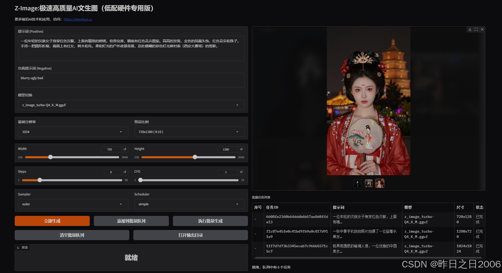 关于模型:内置两个版本的低精度GGUF版模型,如果显卡低于6G显存,可选择更低的模型,点此下载,比如下载Q3版模型,下载后,放到ComfyUI\models\unet目录,在WebUI或ComfyUI中切换即可。