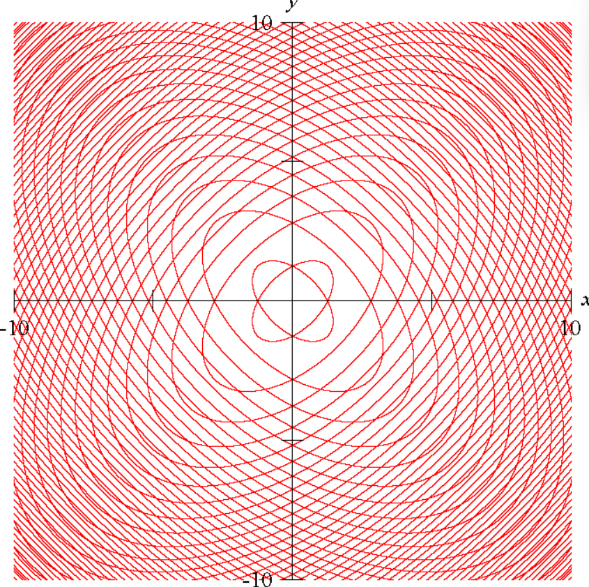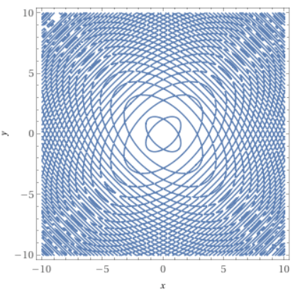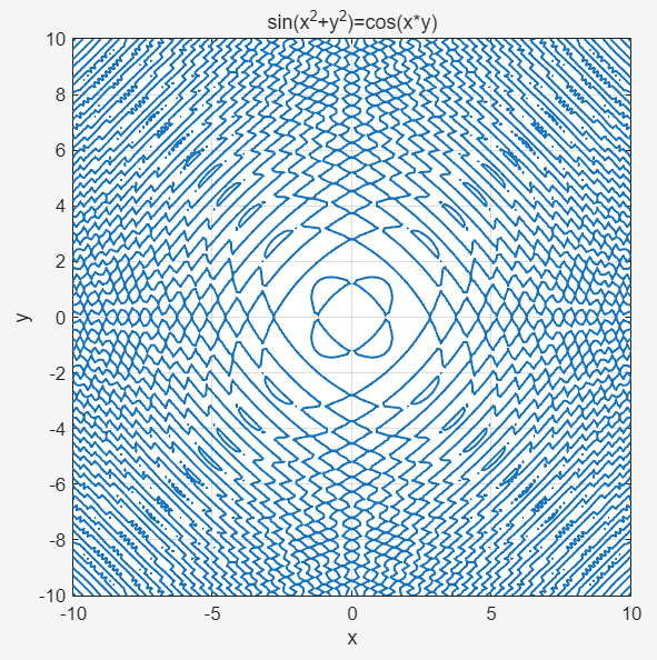 以隐函数方程 sin(x^2+y^2)=cos(x*y) 为例,下面分别是 Desmos、GeoGebra、Wolfram Alpha 和 Matlab 绘制该方程图像的效果:
