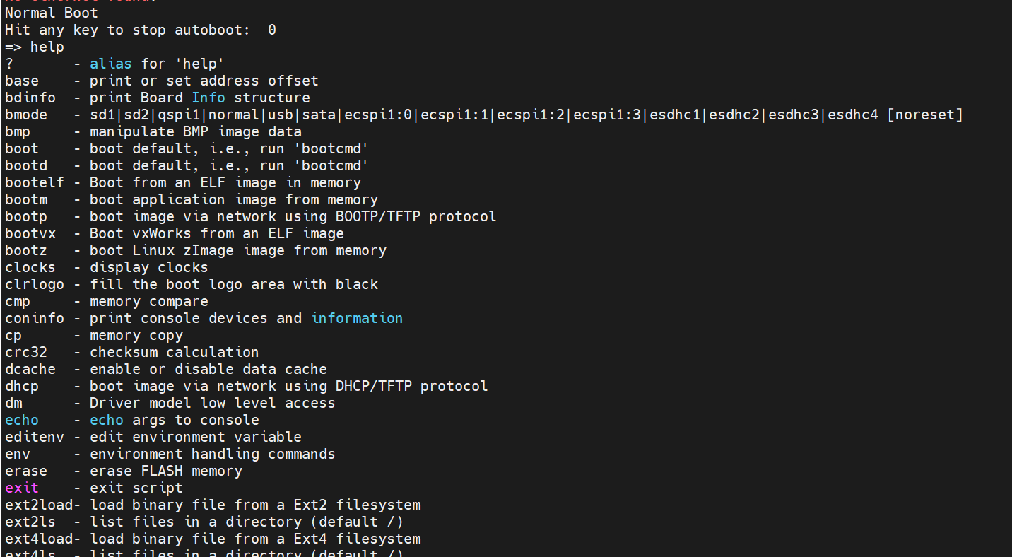 u-boot 支持EMMC和SD卡,因此也要提供EMMC和SD卡的操作命令。一般认为EMMC和SD卡是同一个东西,所以没有特殊说明。mmc是一系列的命令,其后可以跟不同的参数,输入"? mmc"即可查看 mmc有关的命令: