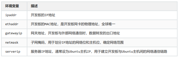 开发板内核启动后,通过 DHCP 自动获取 IP 地址 | 替代手动设置ipaddr:serverip:gateway,简化网络配置(需路由器 / DHCP 服务器分配 IP) |