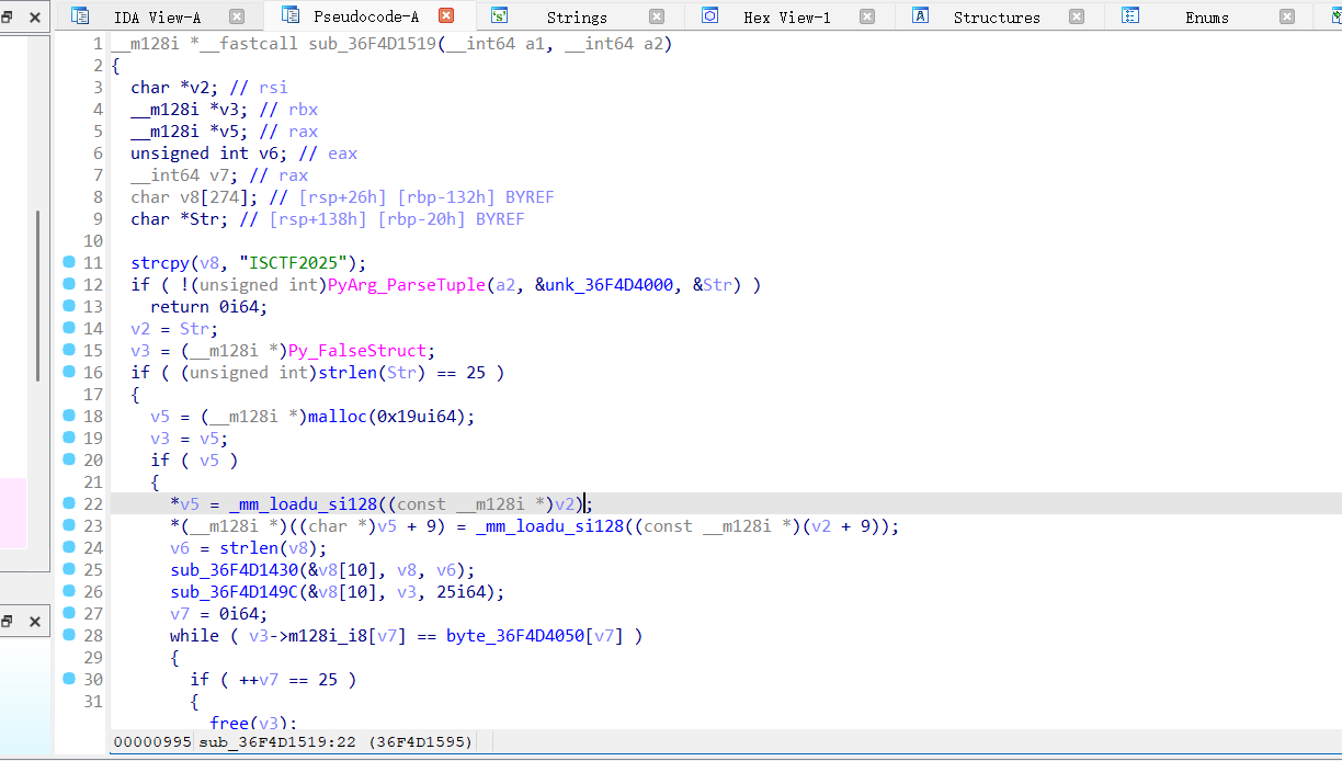 这就是一个加密流程,输入一个 24 字节的字符串,程序把它按3字节一组切成8组,每组做 base64→md5→重排后拼在一起,这边种子是固定的161,但是最后也没用到,所以我们可以进行逆向操作