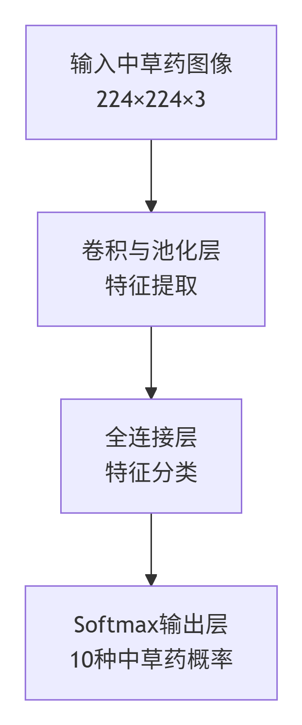 - 输出层:通过Softmax函数输出10类中草药的识别概率分布