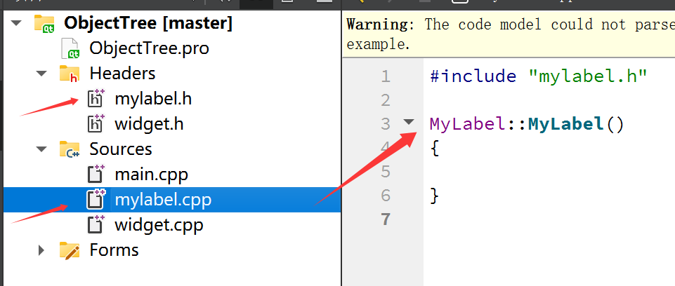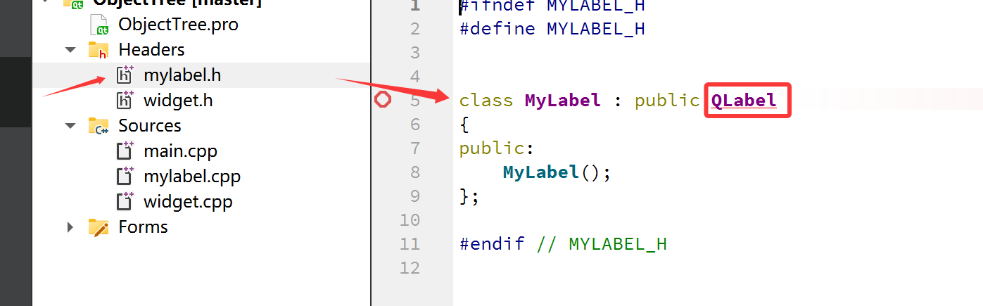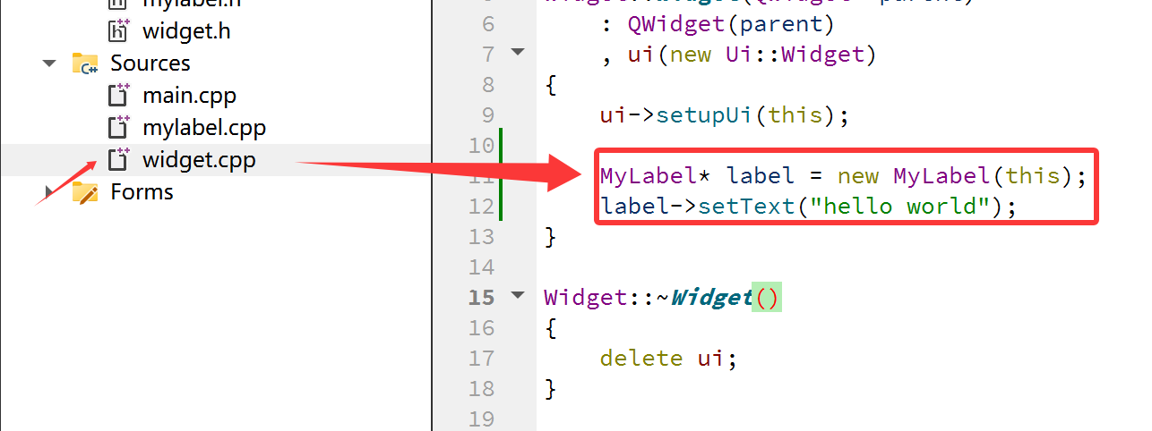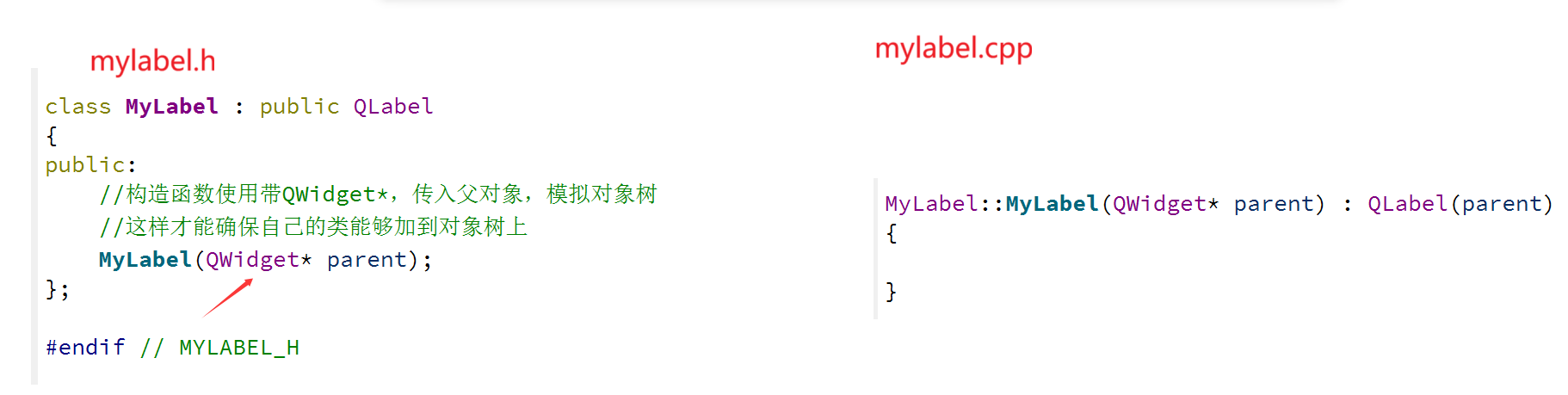 - 对于Qt自动生成的MyLabel构造函数,我们需要进行修改,不使用无参的构造函数,使用带QWidget*参数的构造函数,传入父对象,模拟对象树,这样才能确保自己的类能够加到对象树上。