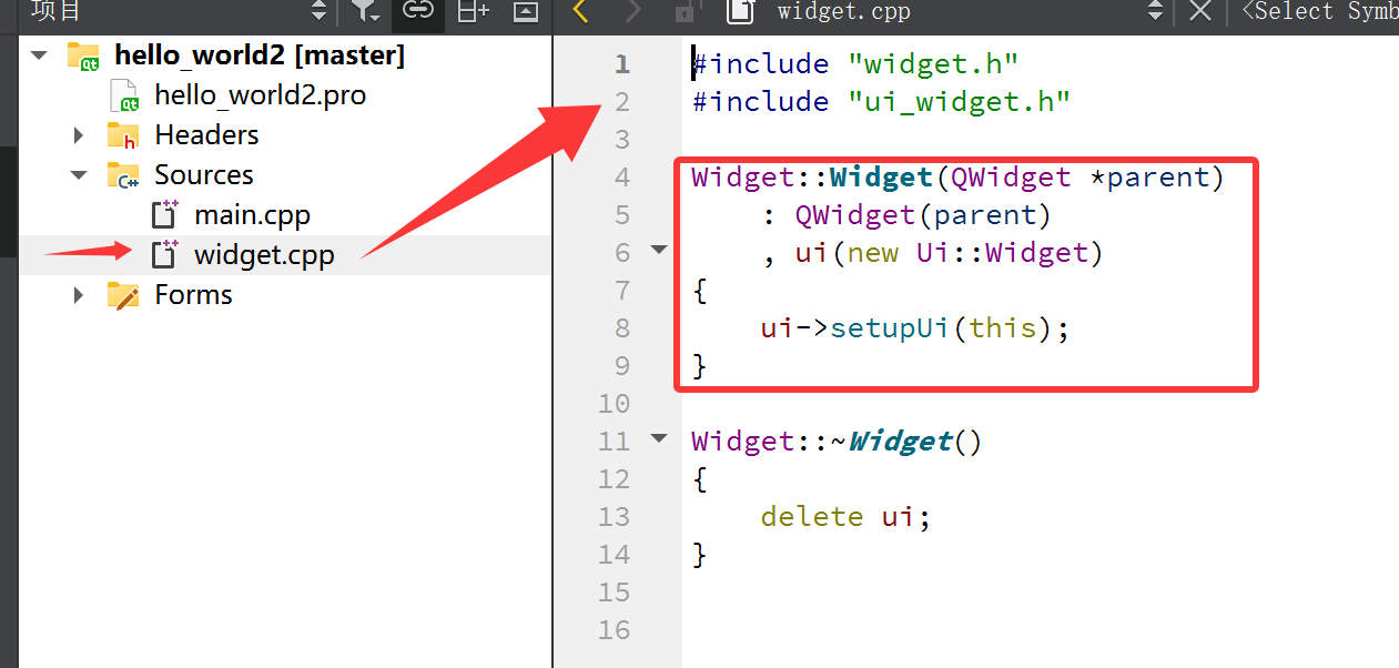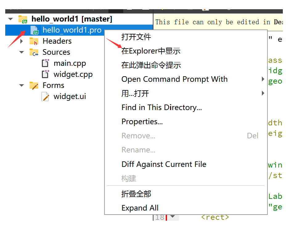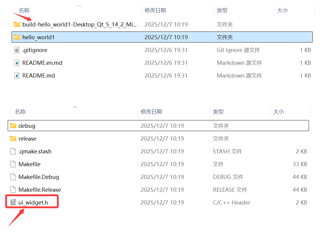 - 鼠标右击.pro文件,选择在Explorer中显示,找到hello world生成的build文件夹,点击进去找到ui_widget.h,这个文件就是qmake根据ui文件的xml文件内容自动生成的代码的头文件