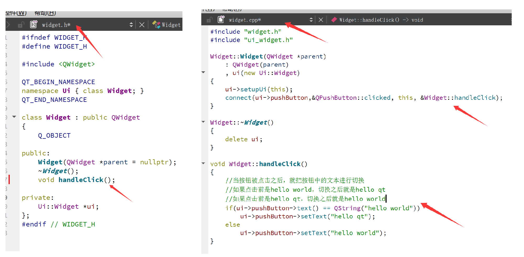 - handleClick函数实现,首先在widget.h文件中声明函数,再在widget.cpp文件中实现这个函数,test函数是获取控件中的内容,当按钮点击前是"hello world",那么点击后切换成"hello qt",如果按钮点击前是"hello qt",那么点击后切换成"hello world"