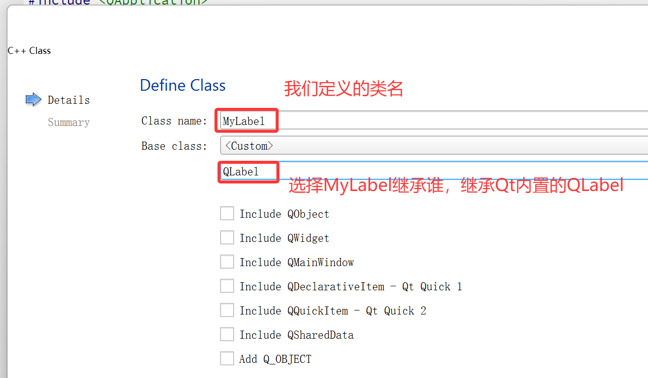- 定义我们自定义的类的名字并选择自定义类继承Qt内置的哪个类,然后点击完成