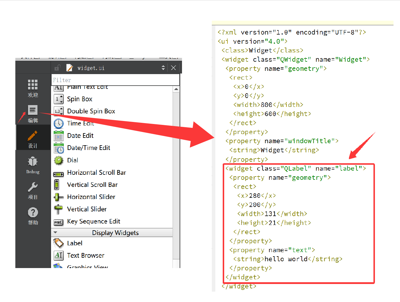 - 点击编辑查看.ui可以看到刚才往界面上拖拽一个QLabel控件。此时在ui文件的xml中多出来了一段代码。qmake会在编译项目时基于这个内容生成一段C++代码,通过这个代码构建出界面内容