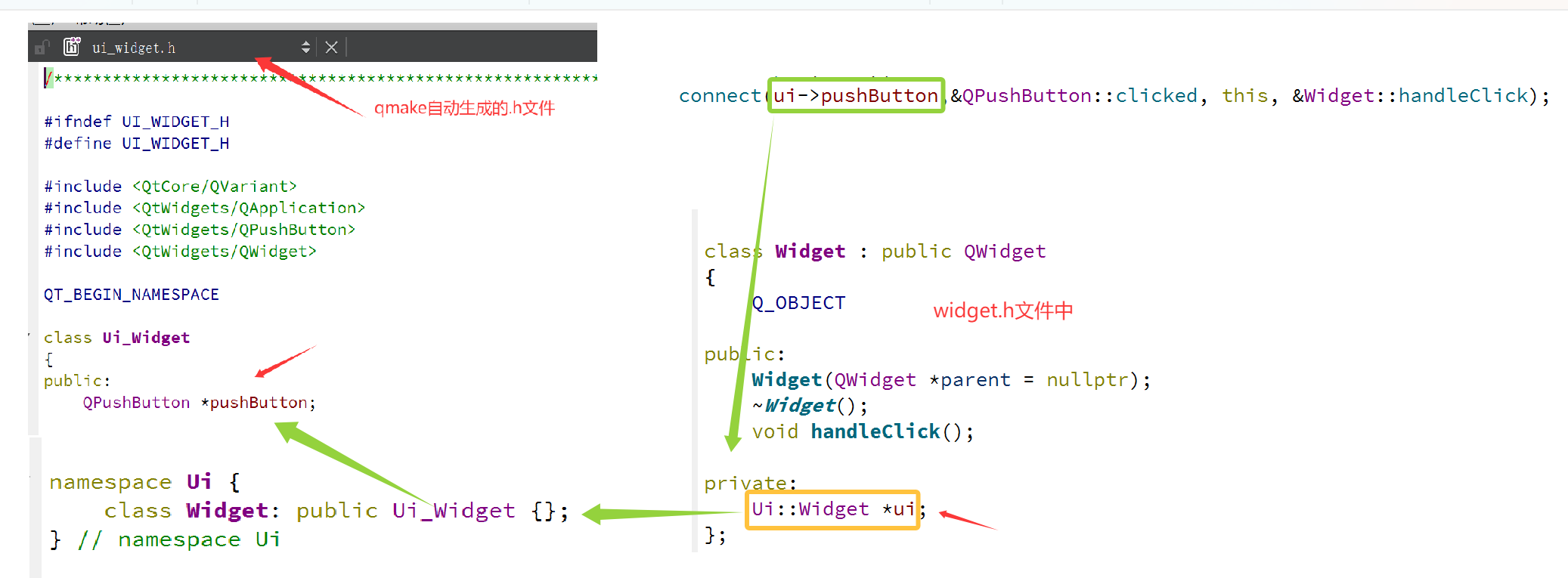 connect(ui->pushButton,&QPushButton::clicked, this, &Widget::handleClick)ui->pushButton访问到form file(ui)文件中创建的控件,谁发出的信号&QPushButton::clicked,点击按钮时会自动触发这个信号,发出的是个什么信号this,谁来处理这个信号&Widget::handleClick:具体怎么处理,需要我们自己实现
