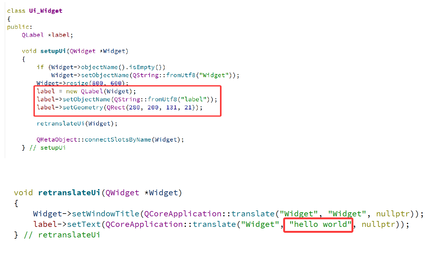 - 查看ui_widget.h文件,可以看到这个文件里面创建了QLabel控件,控件名字、位置,以及控件中的内容hello world