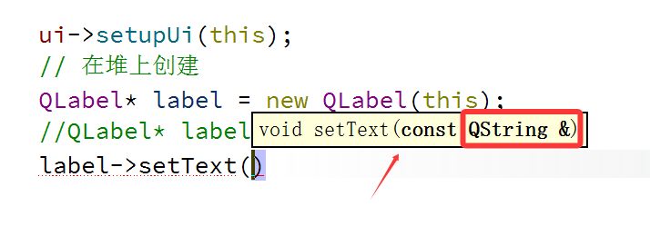 - 给label控件设置文本使用函数setText,传入需要显示的文本,在下面图片中可以看到,传入的是一个const QString& 的对象,因为Qt诞生的早,当时C/C++的有些东西不太好用,因此自己开发了一系列的基础类(QString、QVector、QList、QMap等)