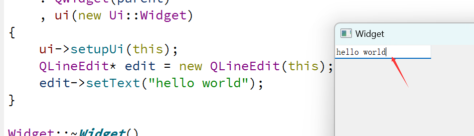 和通过纯代码方式实现hello world程序(Label)一样,创建一个QLineEdit* 对象,并使用setText在对象中输入hello world,同样需要包含头文件#include < QLineEdit >
