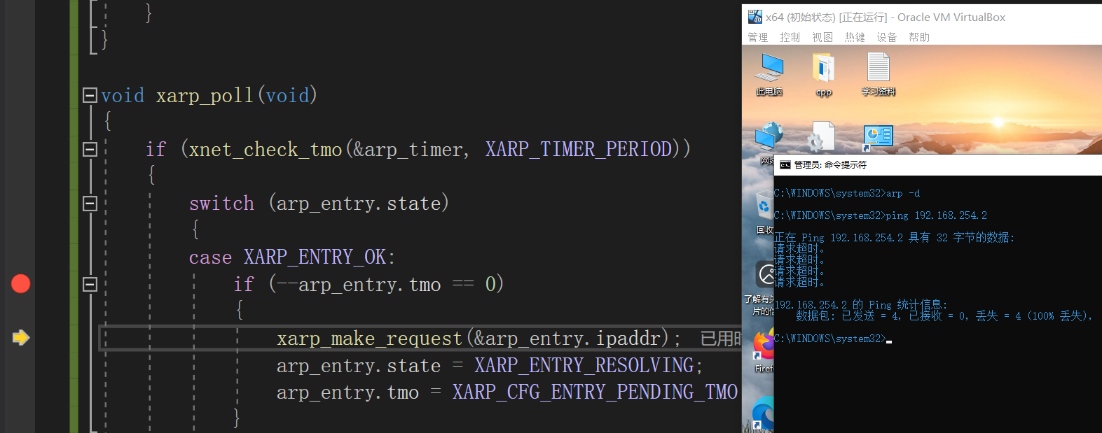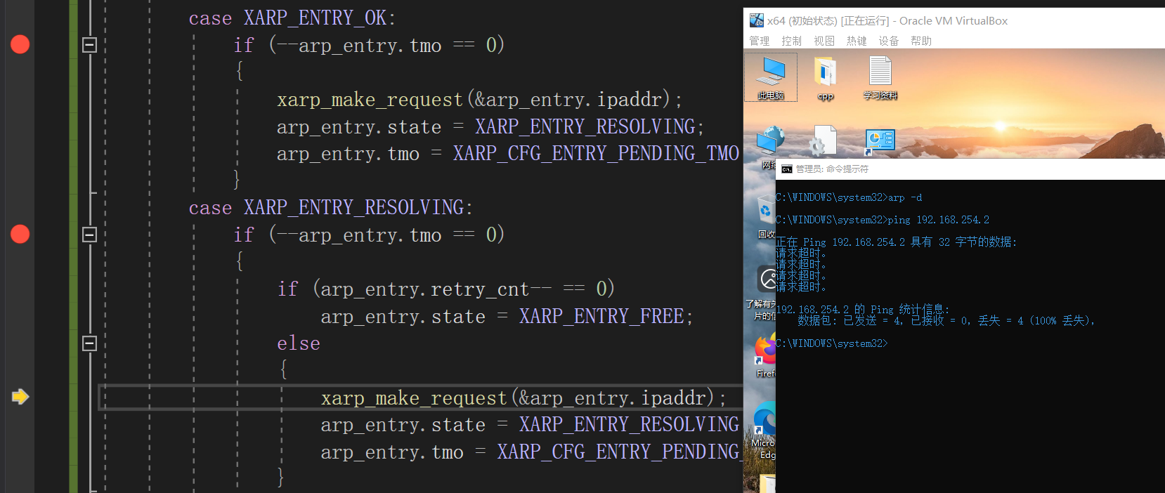 ②使用虚拟机ping 192.168.254.2,观察5s之后能否进入XARP_ENTRY_OK的处理函数
