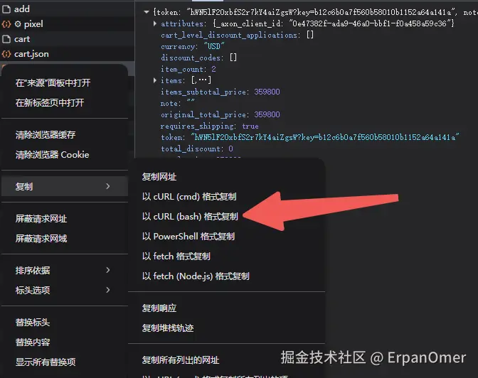 第二步:请求上右键 -> 复制 -> cURL 格式复制。