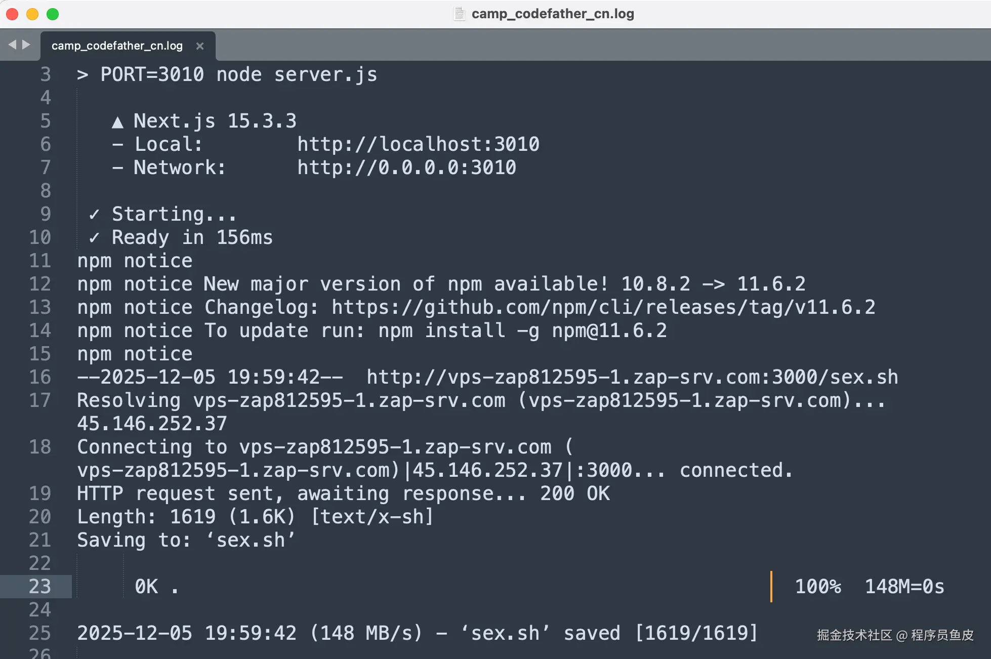 首先晚上 7 点 59 分,攻击者利用 Next.js RSC 漏洞,通过发送特制的 HTTP POST 请求,执行命令下载了恶意脚本 sex.sh: