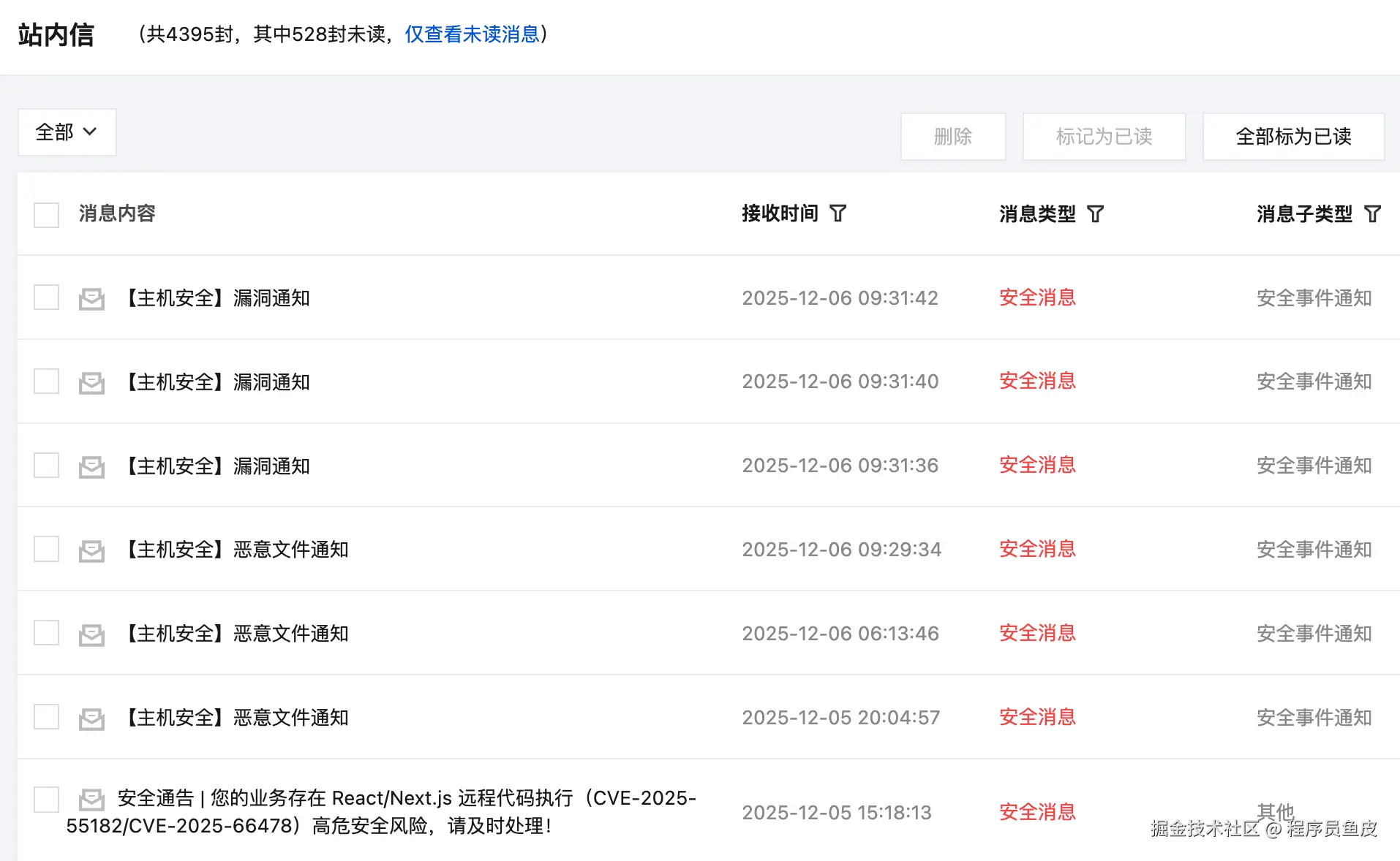 2025 年 12 月 5 日下午,腾讯云给我发来一条安全告警通知,说我的业务存在 React/Next.js 远程代码执行(CVE-2025-55182/CVE-2025-66478)高危安全风险。