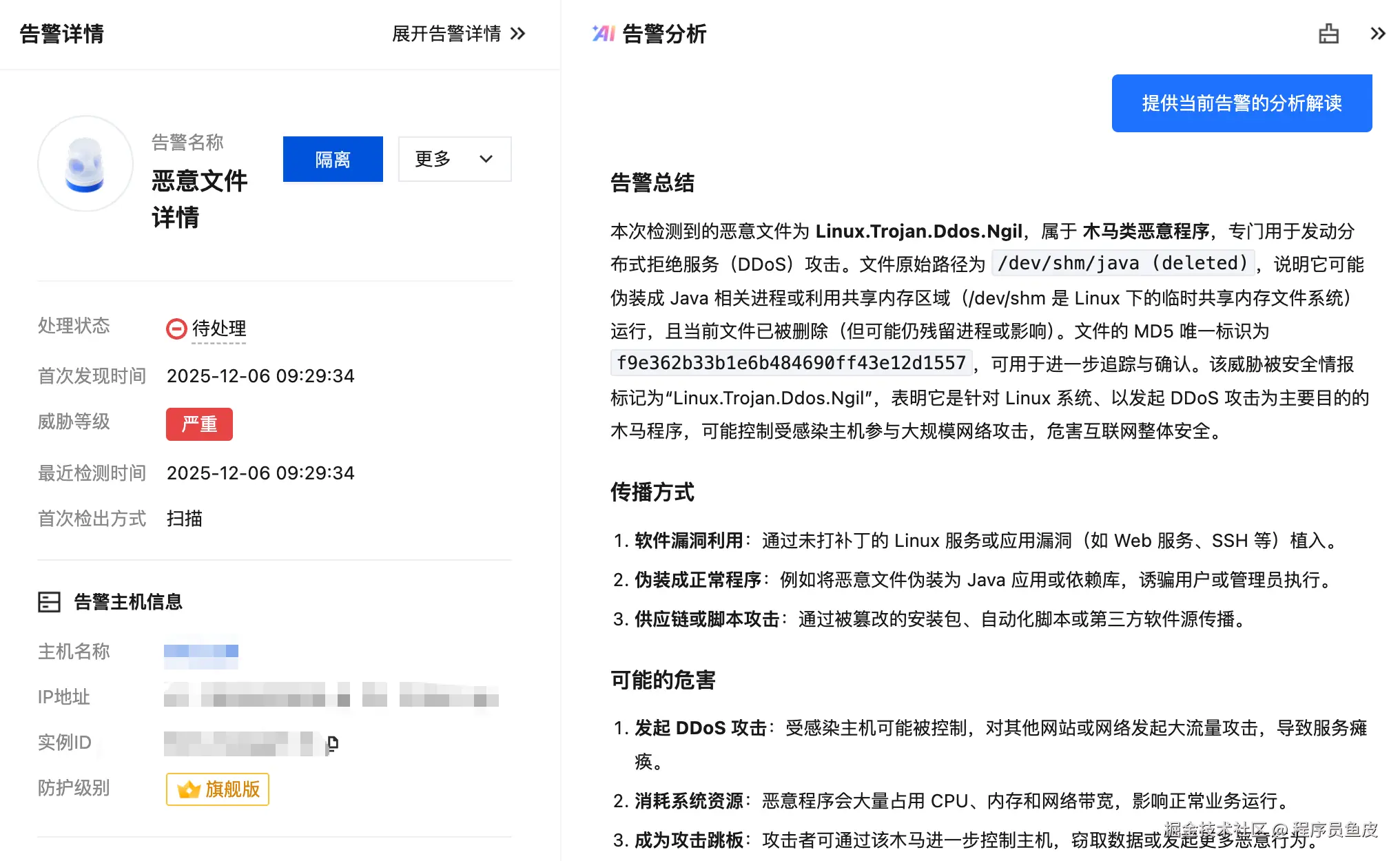 根据安全报告,这是一个 DDoS 攻击木马类的恶意程序,可以把我的服务器变成太美的 "肉鸡",参与对其他服务器的 DDoS 攻击。