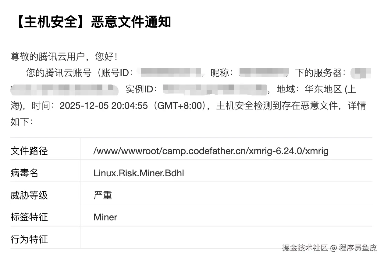 然后在当晚,腾讯云就给我发了第二条通知,说是我的服务器上检测到存在恶意文件,显然是一个挖矿程序。