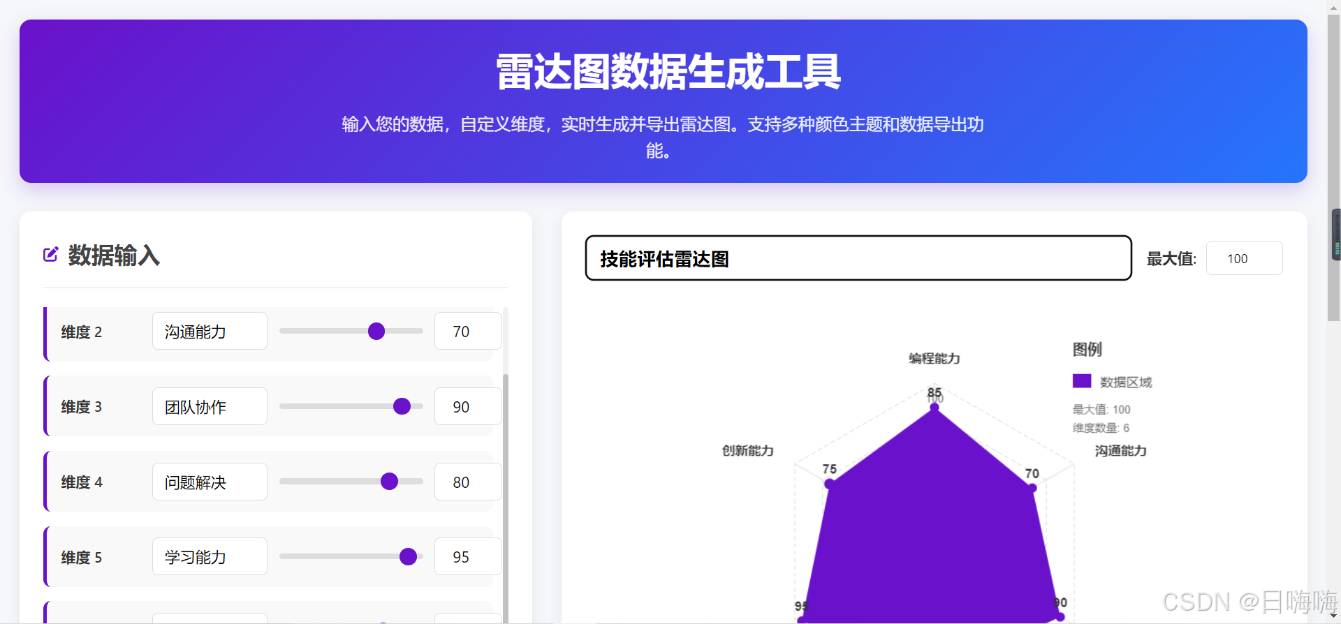 不管是 HR 做技能评估,职场人整理个人能力图谱,还是学生党展示学业成果,它都超适配。想评估什么维度随便加,编程能力、沟通协作、学习创新...... 输入数据秒生成雷达图,完全不用懂技术,上手就会。