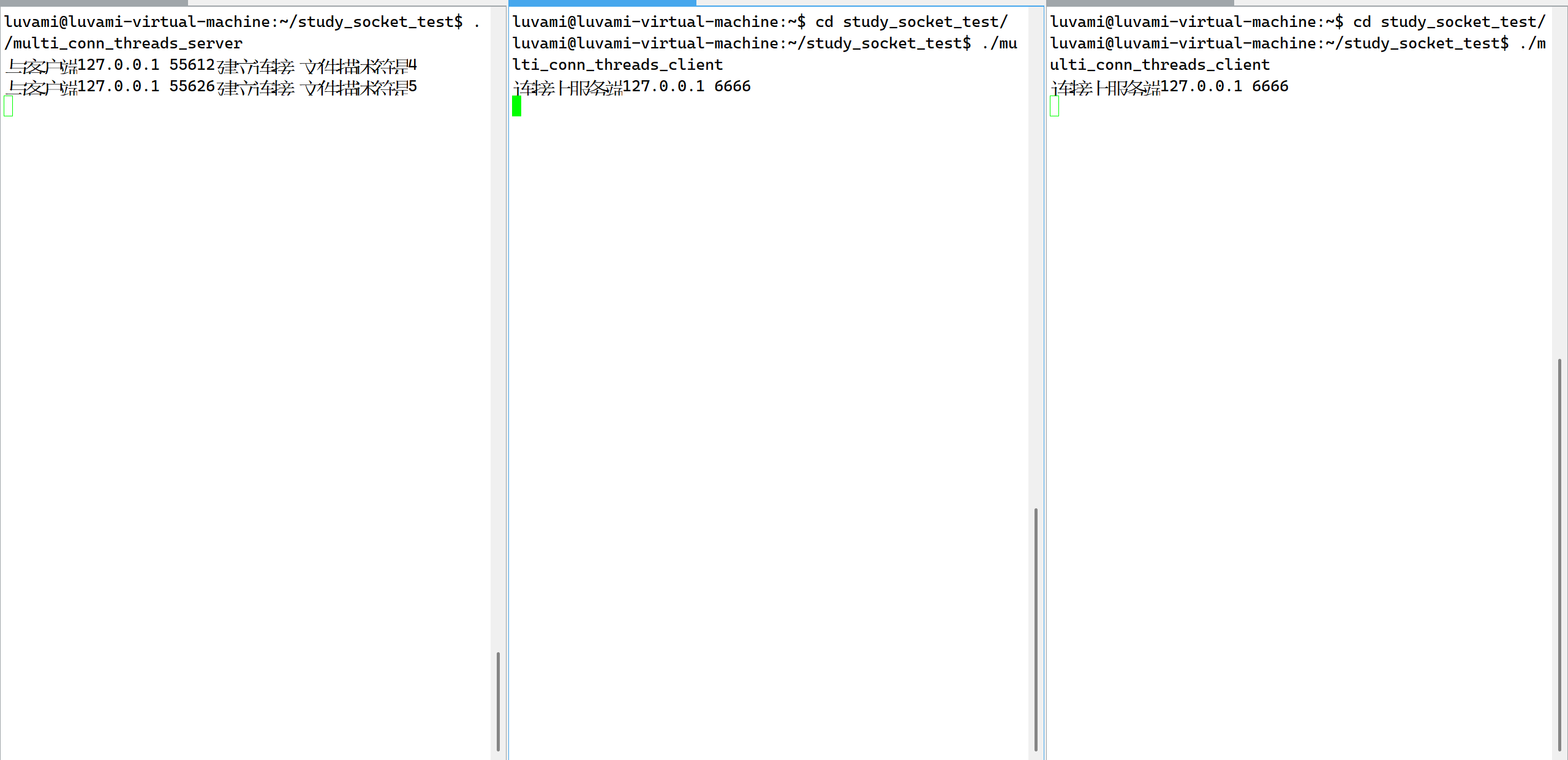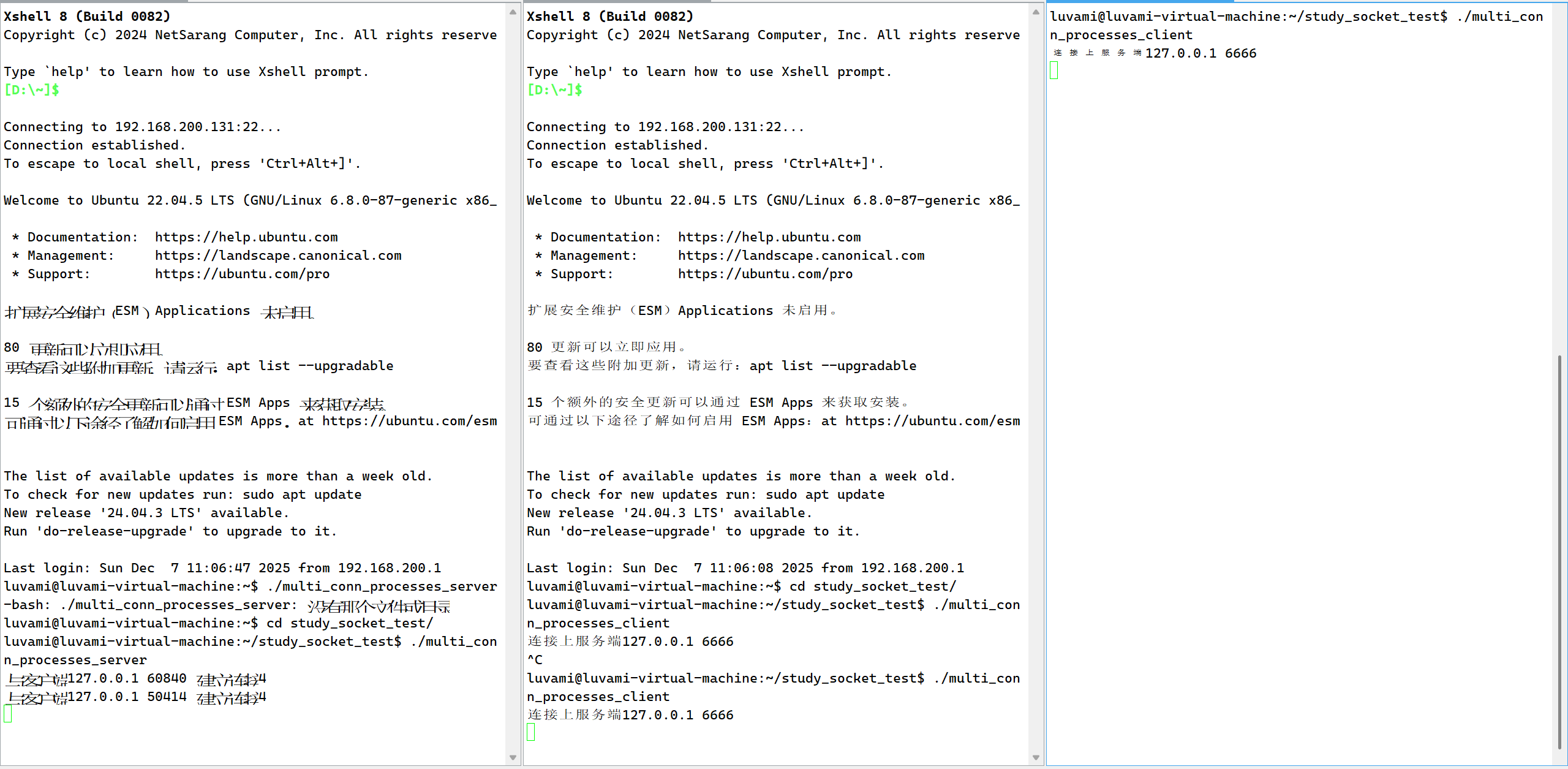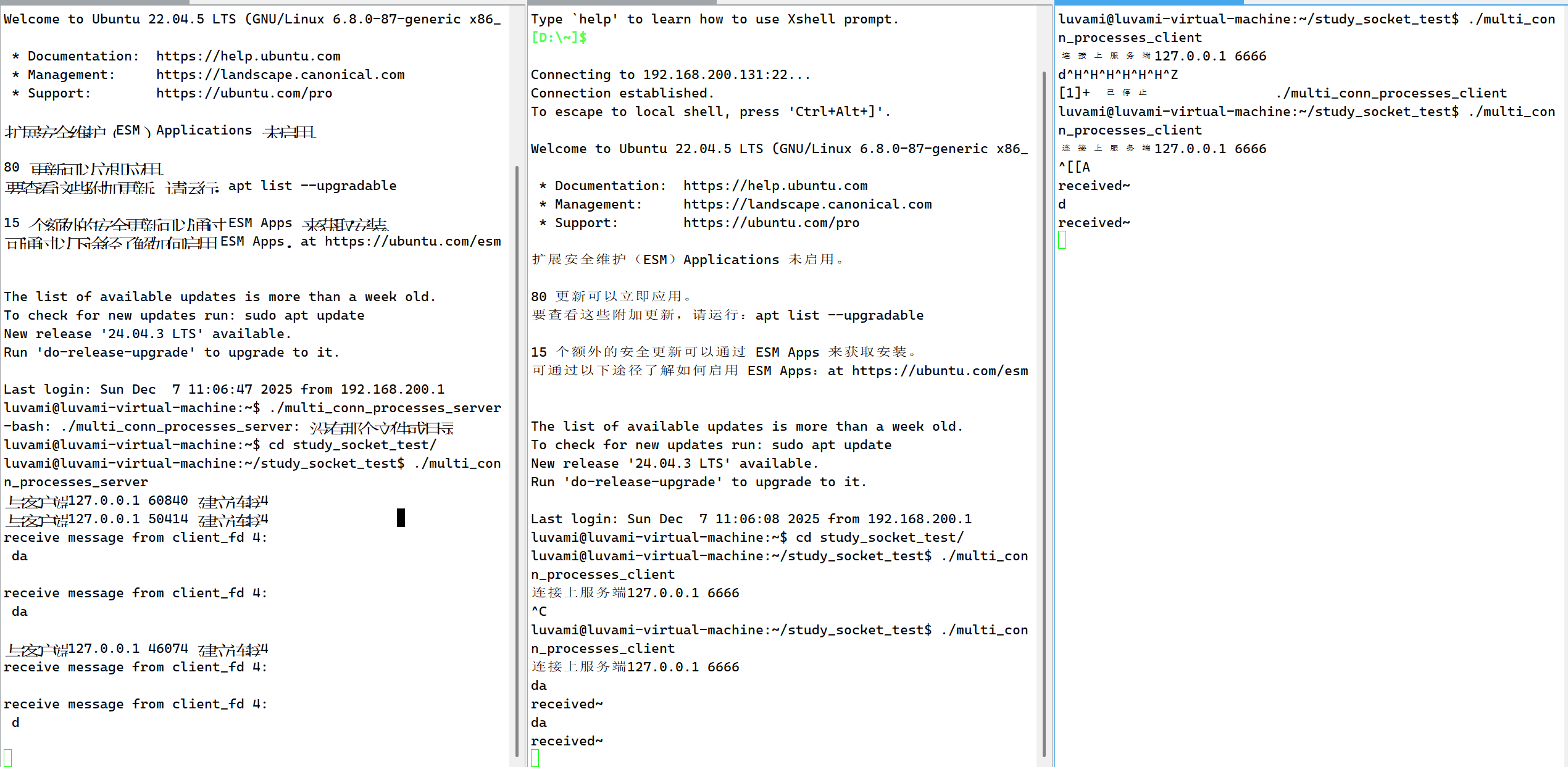 我们在 Xshell 远程开启三个窗口进行测试一个服务端与两个客户端。
