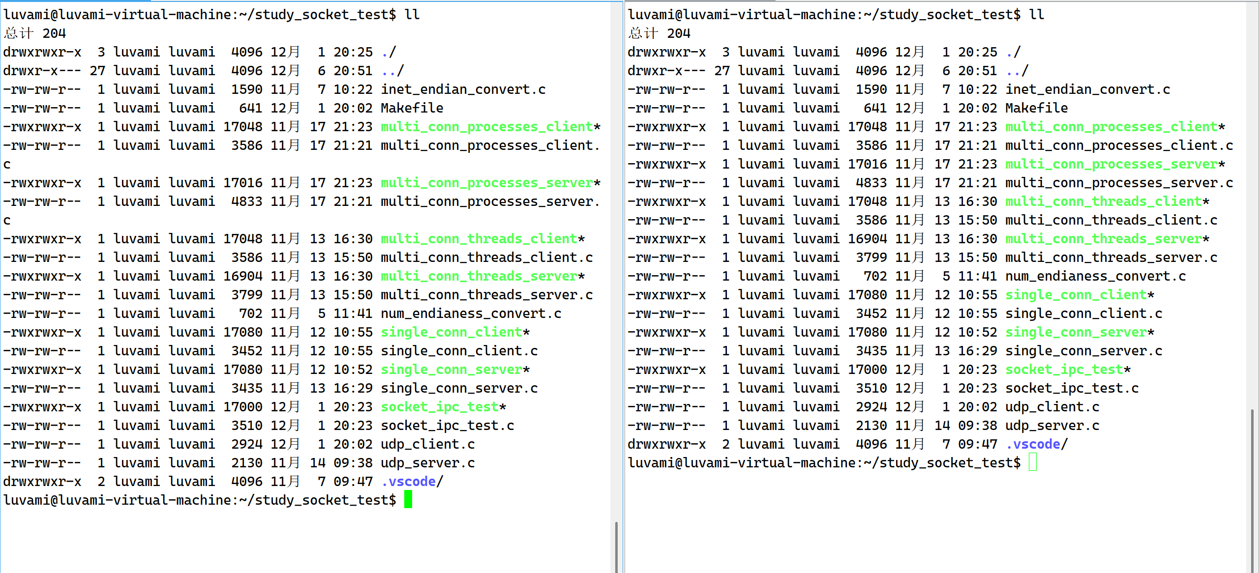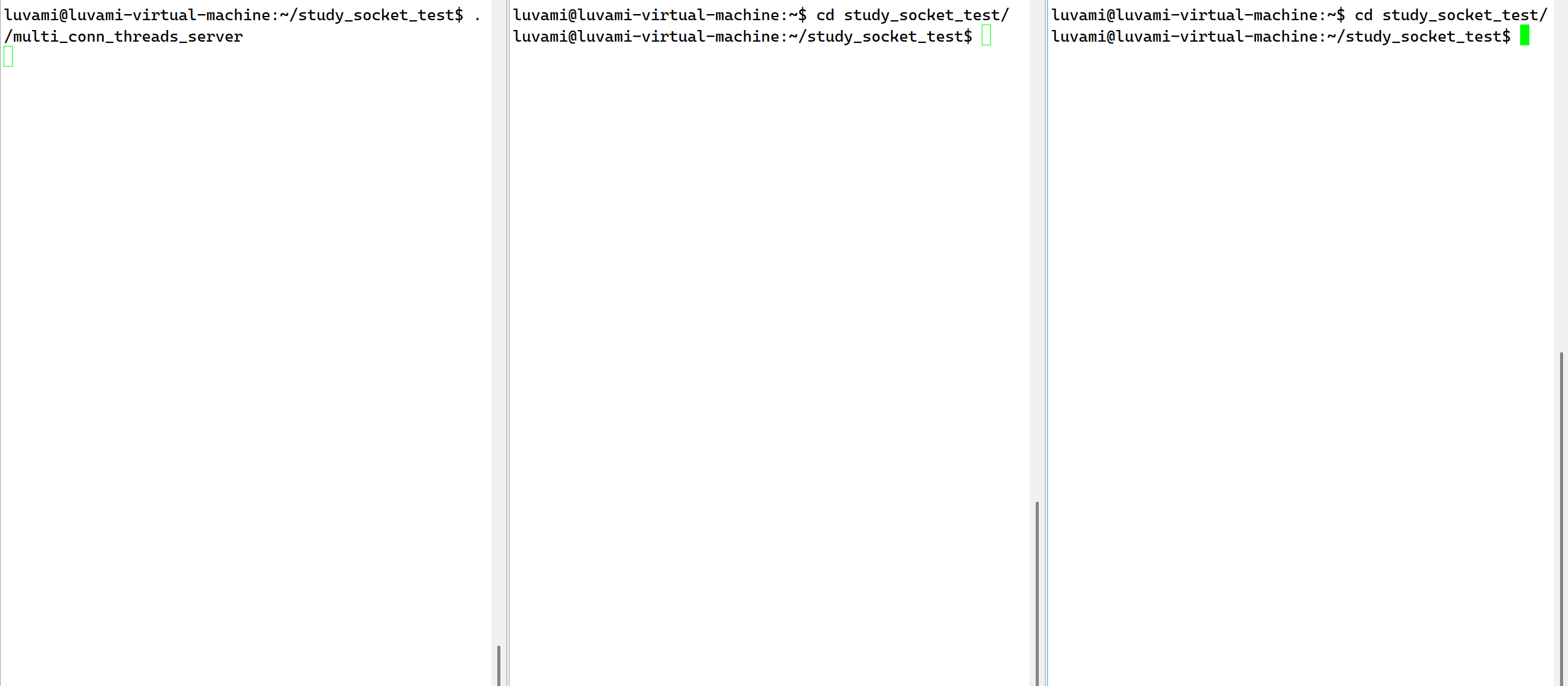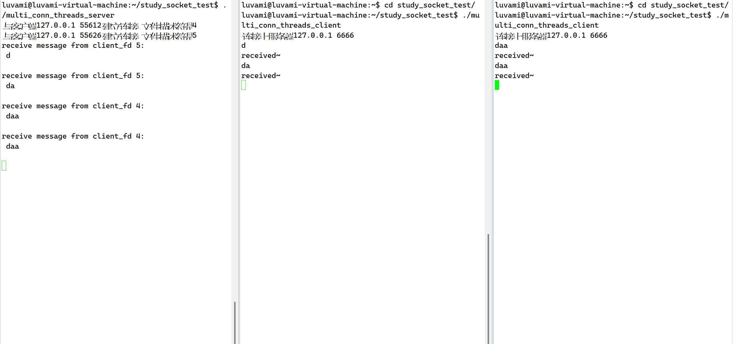 我们在 Xshell 远程开启三个窗口进行测试一个服务端与两个客户端。