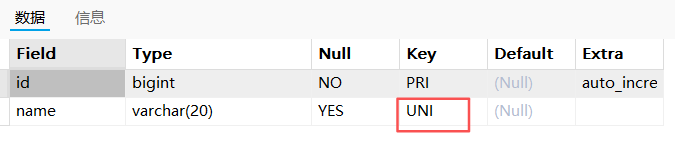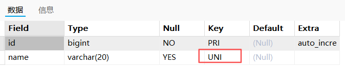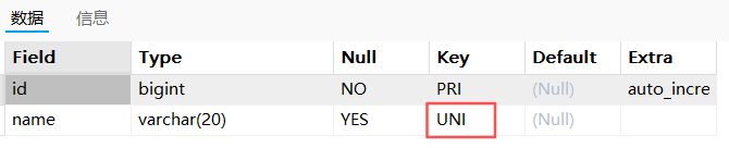 sqlcreate table t_test_uk ( id bigint primary key auto_increment, name varchar(20) unique # 唯一约束 );方式二:创建表时单独指定唯一列