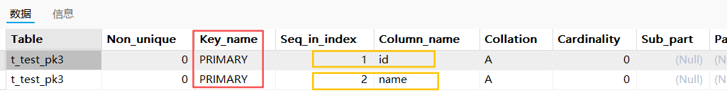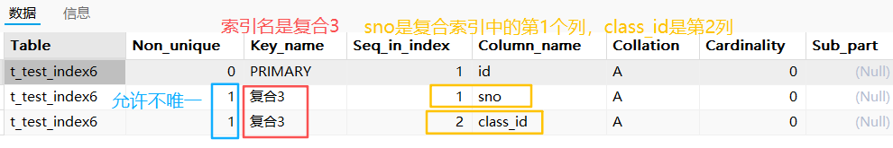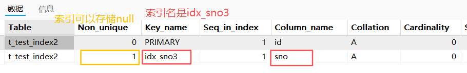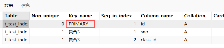 | Key_name | 索引的名称: 截图中是 PRIMARY,这是主键索引的默认名称;普通索引会显示自定义的索引名(如 idx_sno) |