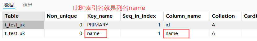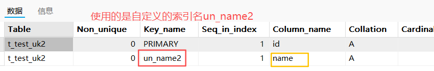 sql#方式三,修改表中的列为唯一索引(alter) create table t_test_uk2 ( id bigint primary key auto_increment, name varchar(20) ); alter table t_test_uk2 add unique un_name2 (name); #指定索引名为un_name2