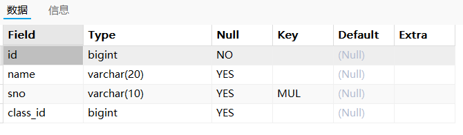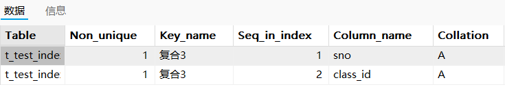 sqlcreate table t_test_index6 ( id bigint primary key auto_increment, name varchar(20), sno varchar(10), class_id bigint ); create index 复合3 on t_test_index6 (sno, class_id);