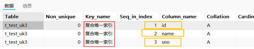 alter table t_test_uk3 add unique 复合唯一索引 (id, name, sno);