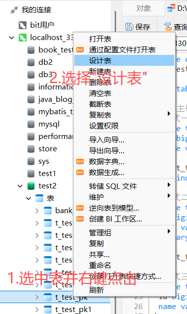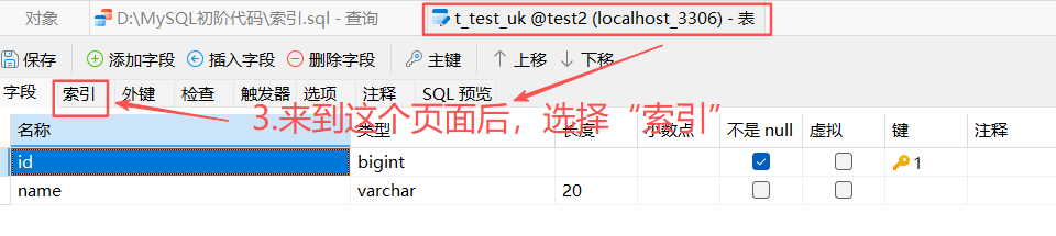 除了使用SQL语句,在图形化界面中,我们对选定的表点击右键 --> 选择"设计表" --> 在"设计表"页面中选项栏选择"索引"