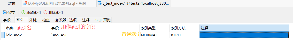 sqlcreate table t_test_index2 ( id bigint primary key auto_increment, name varchar(20), sno varchar(10) ); create index idx_sno3 on t_test_index2(sno); #指定索引名为idx_sno3语法:create index [索引名] on 表名(表中的列);