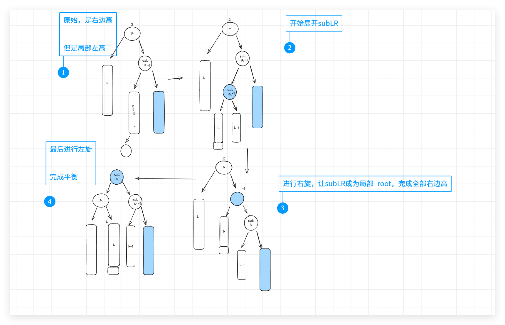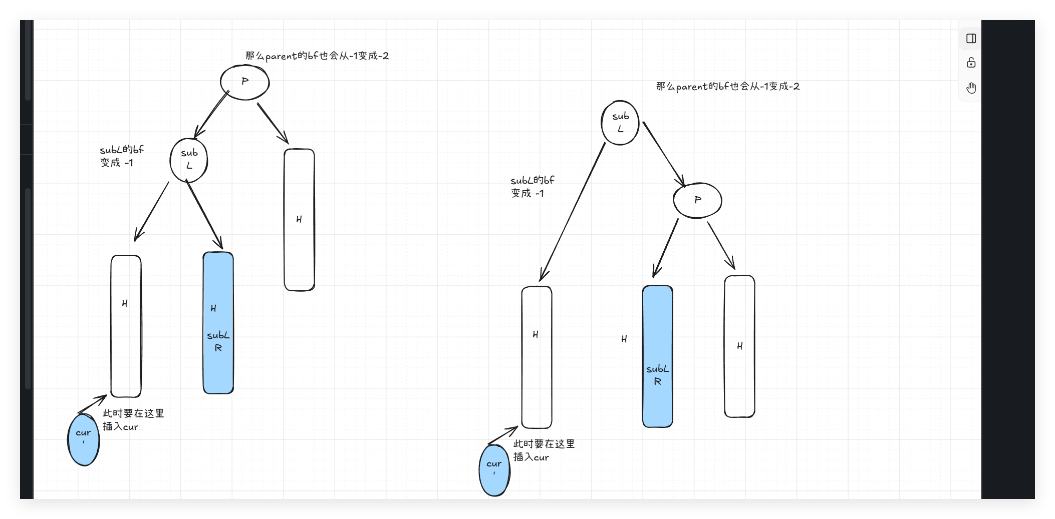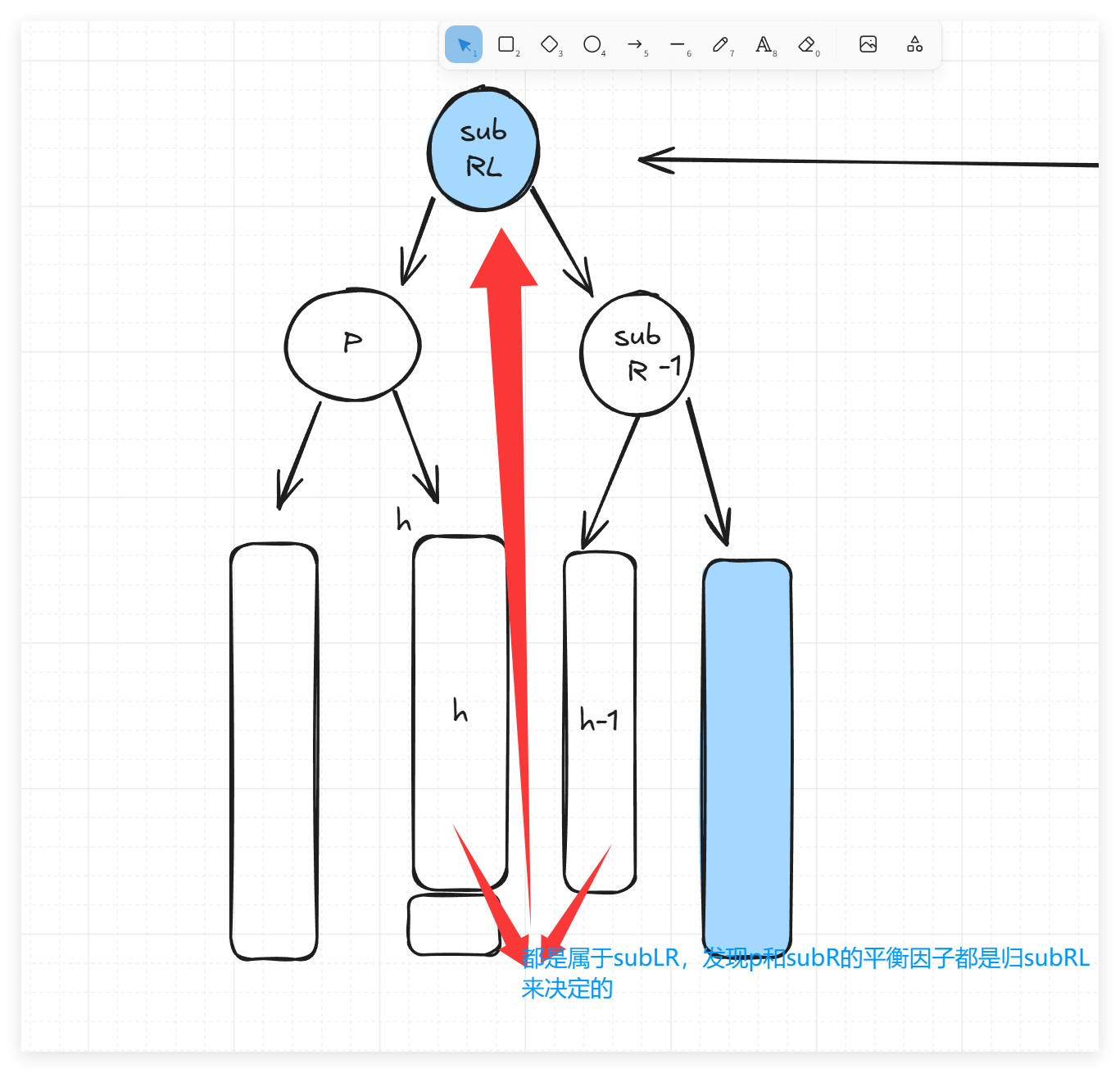 这三种情况都是可以看图看出来的,如果subRL是平衡的,那么三个地方都是0,如果是-1,那么说明是右边矮了点,那么会导致subR的平衡因子是1.(做subR的左子树)。如果是1,那么同理,会导致p的_bf为-1.